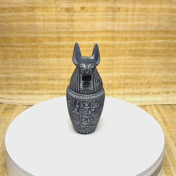 Step into the mystical world of ancient Egypt with this genuine basalt stone Canopic jars set, meticulously hand-carved and inscribed with sacred hieroglyphs and mystical scenes mirroring authentic artifacts. These powerful vessels were traditionally used to preserve organs for the afterlife, each guarded by one of the Four Sons of Horus:
