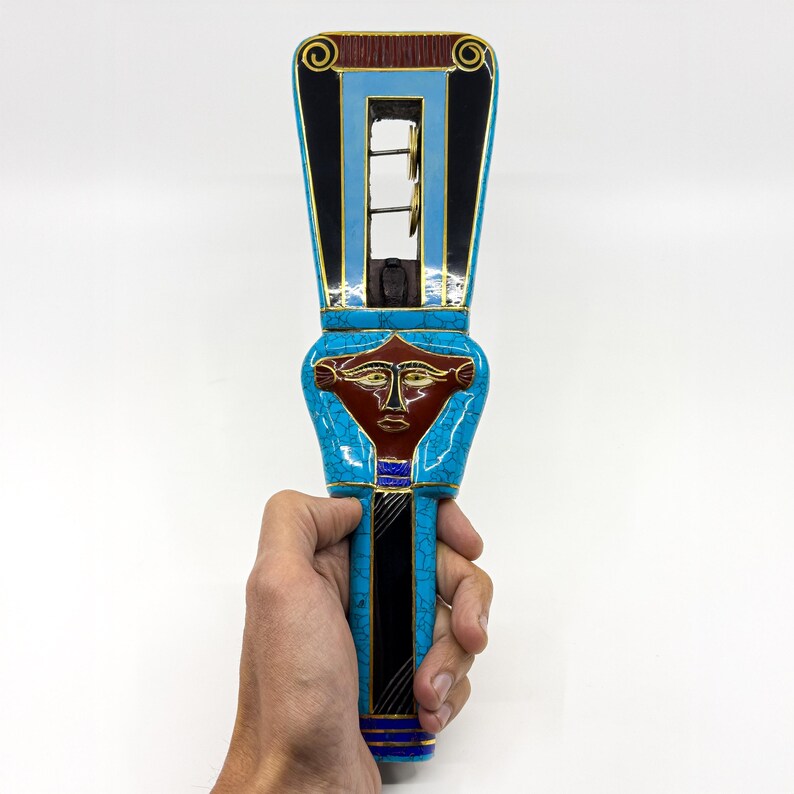 This exquisite sistrum, sacred to Goddess Hathor, isn't just an artifact - it's a living conduit of cosmic energy. Handcrafted in Egypt using traditional methods, each piece resonates with millennia of spiritual power.