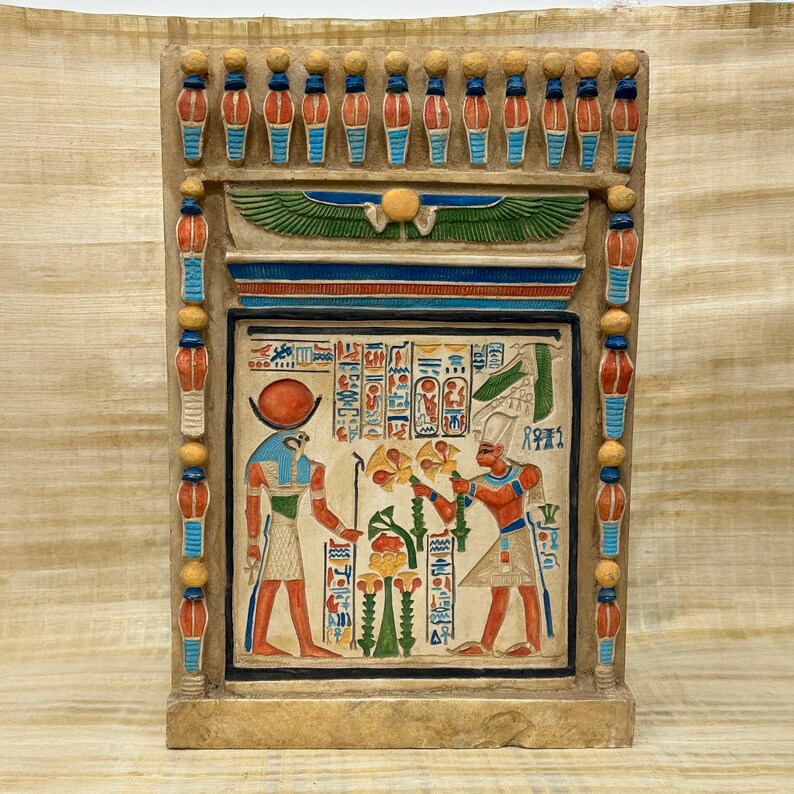 Step into the world of pharaohs and gods with this exquisitely hand-carved stone stele, depicting a sacred offering ritual to Ra, the mighty Sun God. Meticulously crafted in Egypt by skilled artisans, this museum-quality reproduction captures every intricate detail of ancient temple art - from the pharaoh's ceremonial headdress to the sacred hieroglyphics framing this divine encounter.
