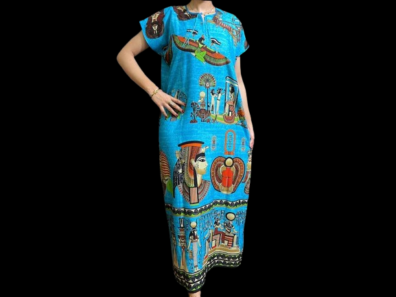Awaken your divine feminine energy with this exquisitely handcrafted Egyptian kaftan, adorned with authentic Pharaonic artwork featuring the mystical winged Isis. Each stitch carries the power of sacred hieroglyphs, temple symbols, and ancient blessings to elevate your spiritual practice.