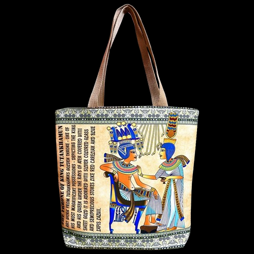 This exquisite handmade Egyptian shoulder bag features a stunning depiction of Pharaoh Tutankhamun and his Queen basking in Aten's golden rays, reproduced from the famous golden throne artwork. Each bag tells the story of: