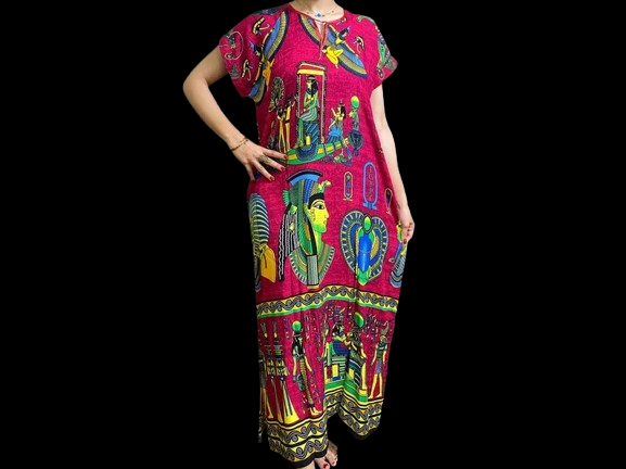 This breathtaking purple and red goddess kaftan is infused with sacred power, hand-embellished with authentic 24K gold Pharaonic hieroglyphs and symbols from the Temple of Isis. More than a dress—this is wearable temple art designed to awaken your inner sovereignty while honoring the legacy of Cleopatra, Hathor, and Egypt's divine feminine lineage.